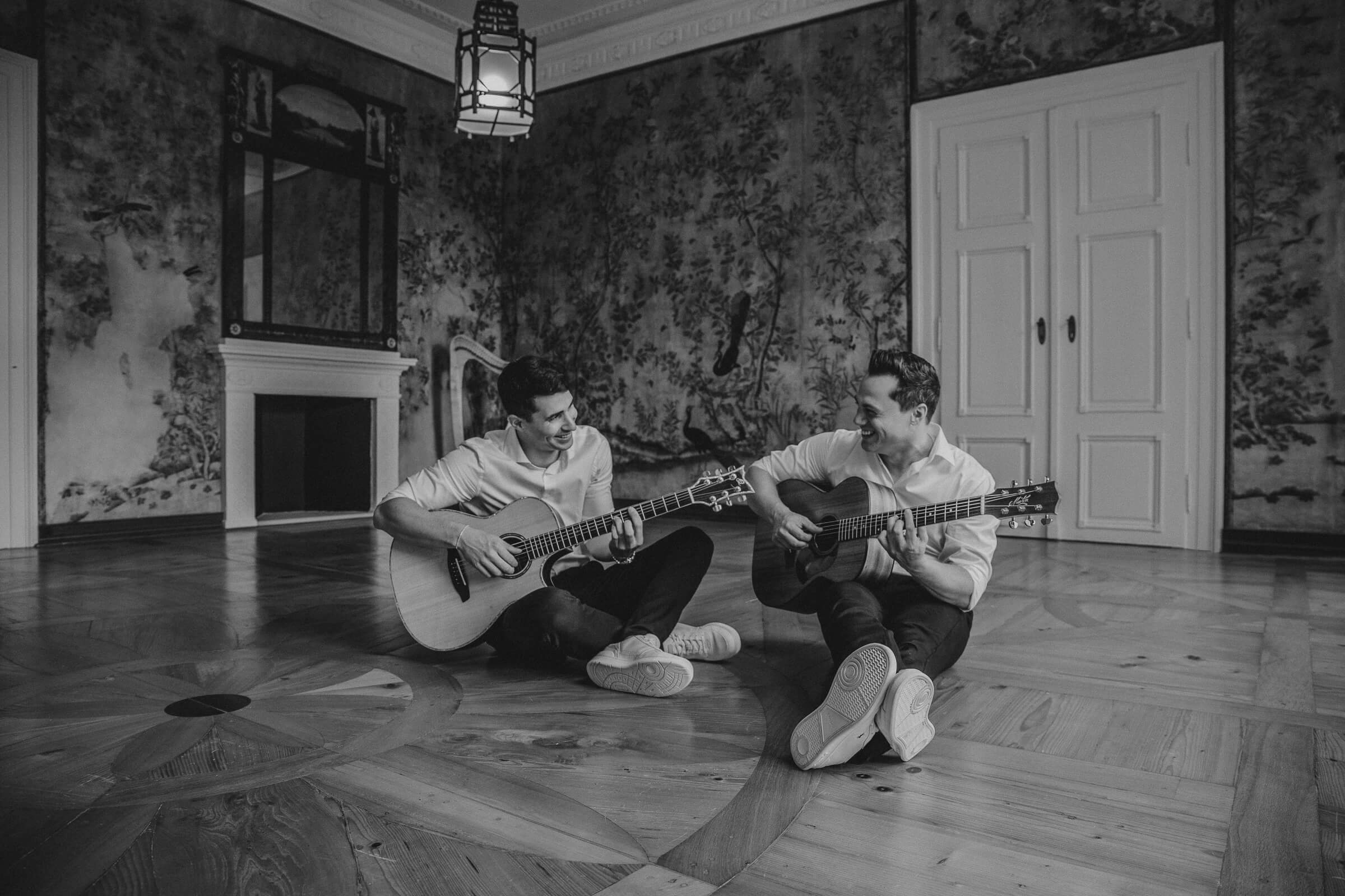 Die Hochzeitsband Day One sitzt gemeinsam auf dem Boden mit Gitarren – monochromes Promo-Foto für Hochzeiten und Firmen-Events